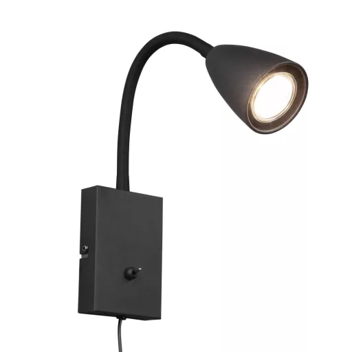 Fekete színű fém vázas fali lámpa fekete színű fém búrával, MR16 GU10-es foglalattal. A lámpa egyéb jellemzői: kapcsoló a lámpatesten, állítható fejű lámpa .