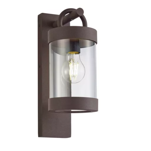 Kültéri fali lámpa rozsdabarna színű alumínium vázzal, átlátszó acryl búrával, E27-es foglalattal és IP44-es védelemmel, alkonykapcsolóval. Az alkonykapcsolást a lámpában a foglalat mellett lévő kapcsolóval akár ki is lehet kapcsolni.