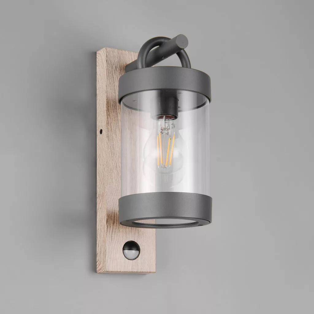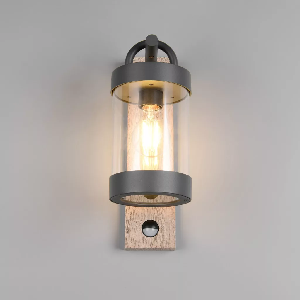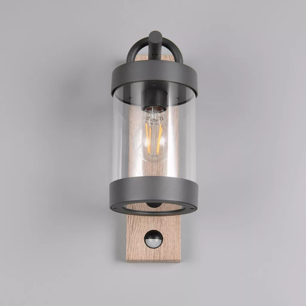 Mozgás-érzékelős kültéri fali lámpa antracit és fa színű alumínium vázzal, átlátszó acryl búrával, E27-es foglalattal és IP44-es védelemmel. A szenzor max. 8m távolságból és 120 fokos látószögben érzékel.