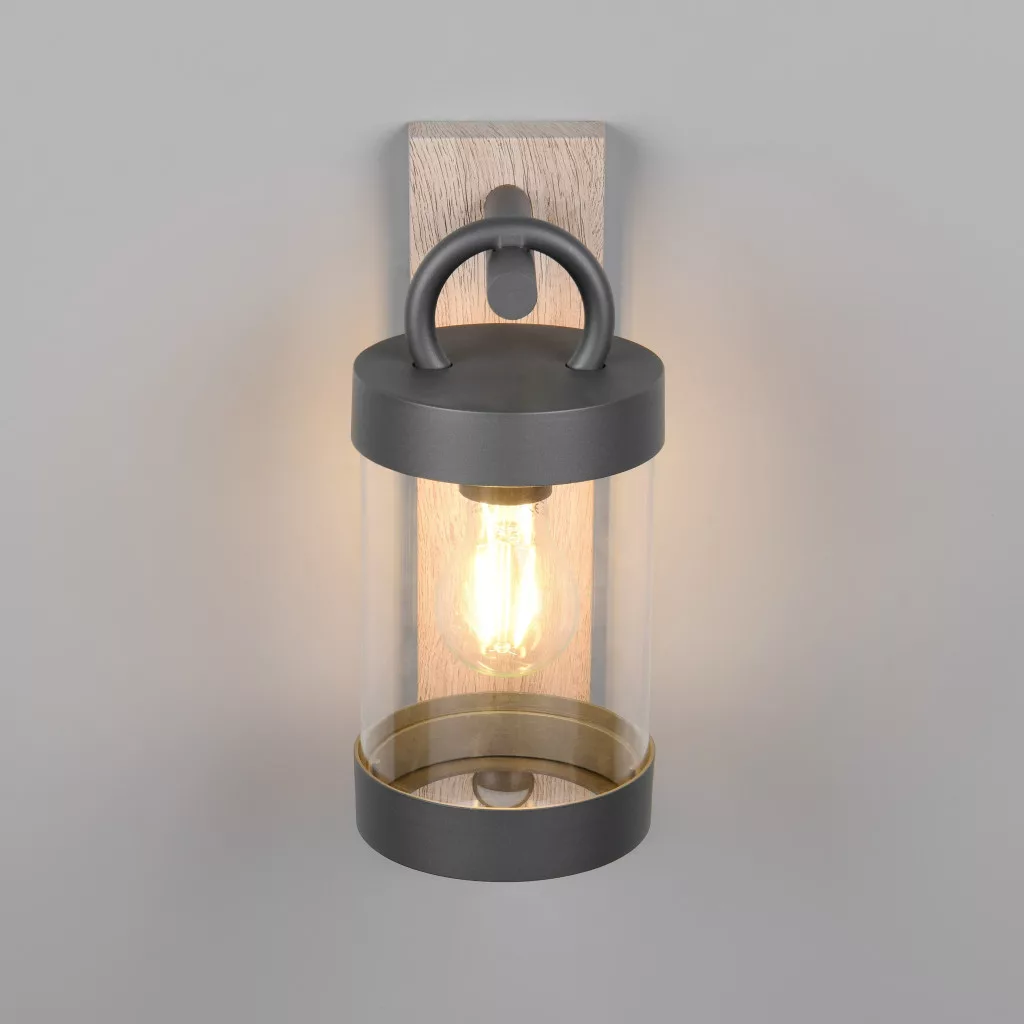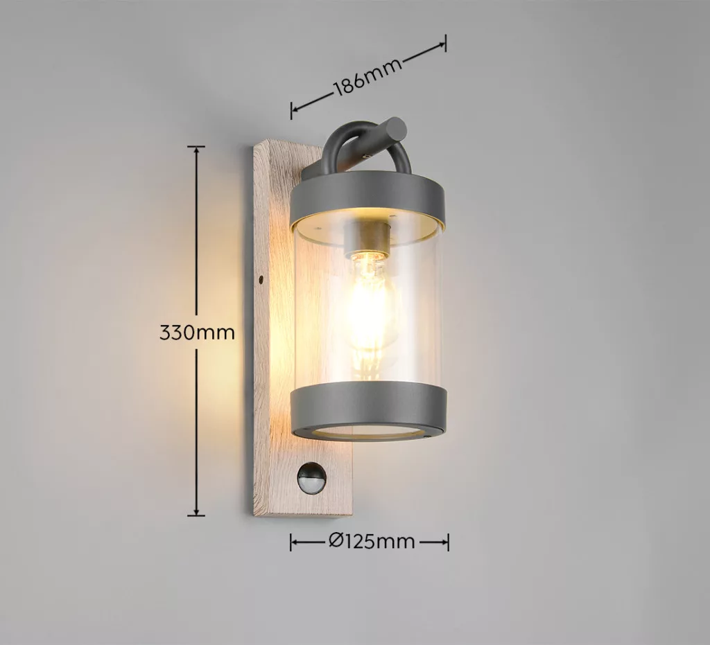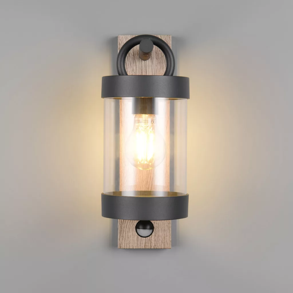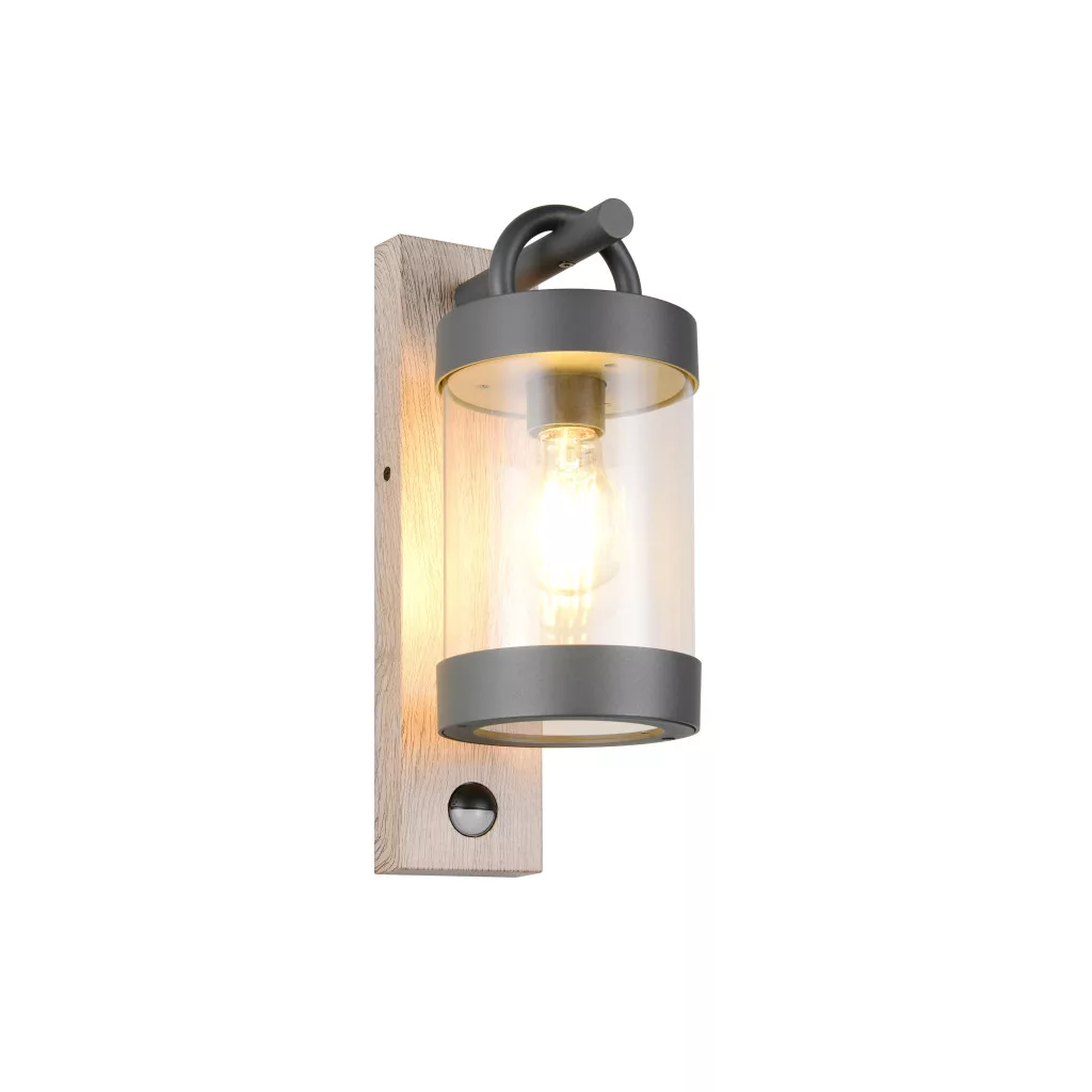 Mozgás-érzékelős kültéri fali lámpa antracit és fa színű alumínium vázzal, átlátszó acryl búrával, E27-es foglalattal és IP44-es védelemmel. A szenzor max. 8m távolságból és 120 fokos látószögben érzékel.