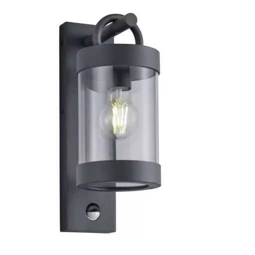 Mozgás-érzékelős kültéri fali lámpa antracit színű alumínium vázzal, átlátszó acryl búrával, E27-es foglalattal és IP44-es védelemmel.