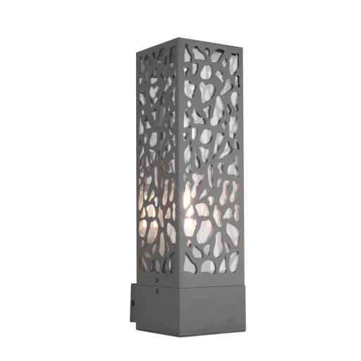 Kültéri fali lámpa antracit színű alumínium vázzal, belül átlátszó műanyag búrával, E27-es foglalattal és IP44-es védelemmel. A perforált külső búra miatt a lámpa rendkívül dekoratív, a fényszórása pedig különleges.