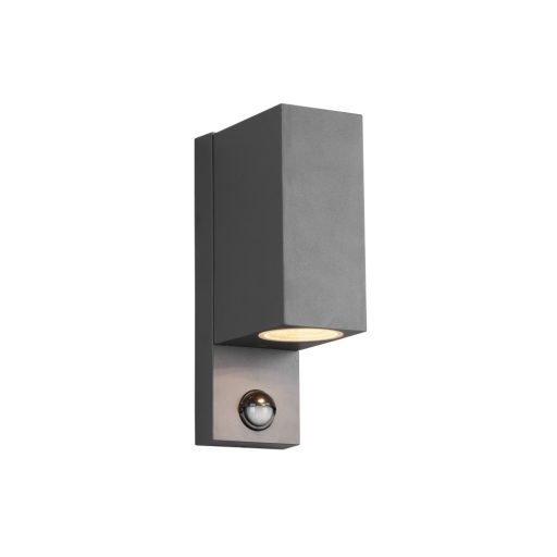 Mozgás érzékelős kültéri fali lámpa antracit színű alumínium vázzal, GU10-es foglalattal, IP44-es védelemmel.