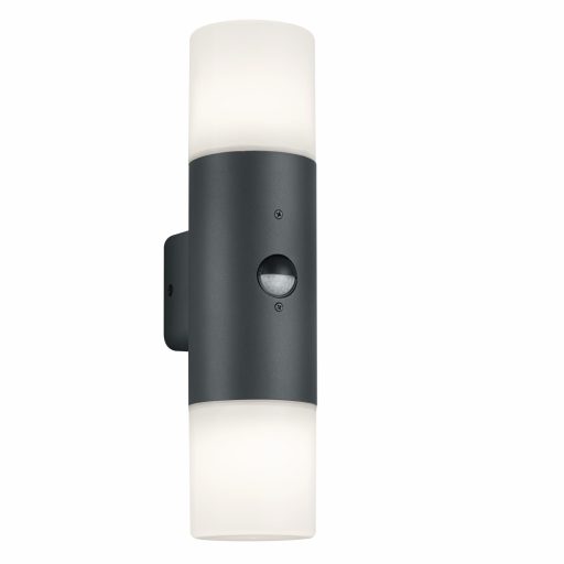 Mozgás-érzékelős kültéri fali lámpa antracit színű alumínium vázzal, műanyag búrával, E27-es foglalattal és IP44-es védelemmel. A lámpa felfelé és lefelé egyaránt világít.