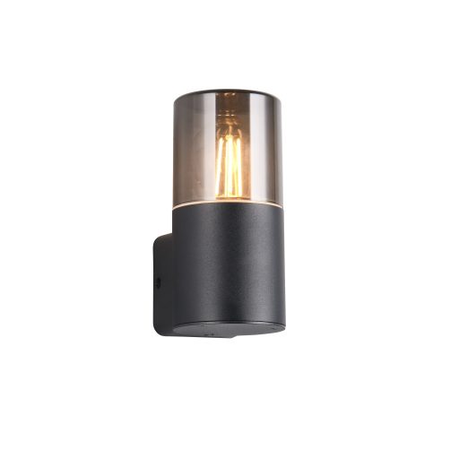 Kültéri fali lámpa fekete színű alumínium vázzal, füstös műanyag búrával, 1db E27-es foglalattal és IP44-es védelemmel.