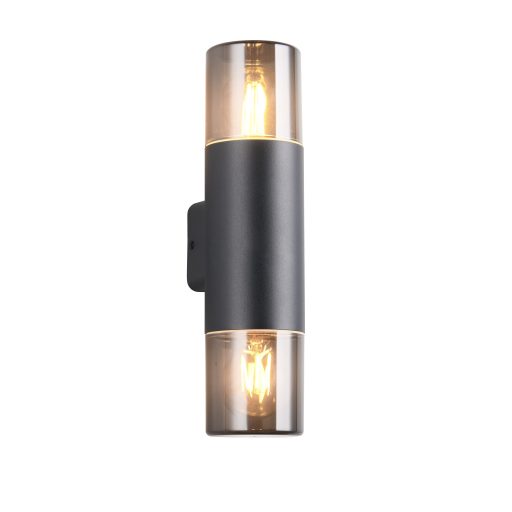 Kültéri fali lámpa fekete színű alumínium vázzal, füstös műanyag búrával, 2db E27-es foglalattal és IP44-es védelemmel. A lámpa felfelé és lefelé egyaránt világít.