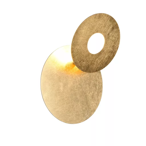 Dekoratív, indirekt fali lámpa arany színű fém vázzal, meleg fehér színhőmérsékletű beépített LED fényforrással. A kör alakú fém lap több pozícióba fordítható, így a lámpa kinézete megváltoztatható.
