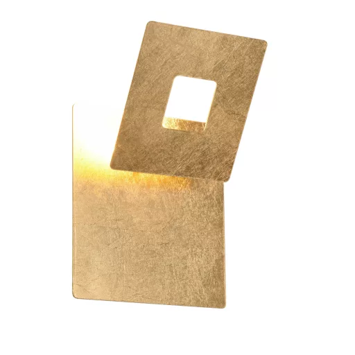 Dekoratív, indirekt fali lámpa arany színű fém vázzal, meleg fehér színhőmérsékletű beépített LED fényforrással. A négyzet alakú fém lap több pozícióba fordítható, így a lámpa kinézete megváltoztatható.