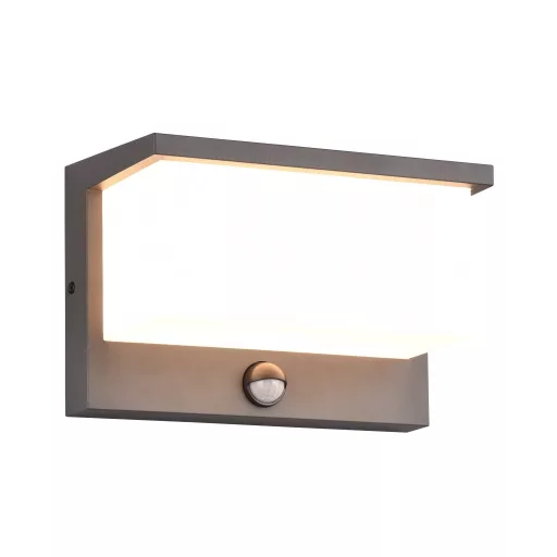 Antracit színű kültéri mozgás-érzékelős alumínium öntvény fali lámpa fehér műanyag búrával, meleg fehér színhőmérsékletű beépített LED fényforrással, IP54-es védelemmel.