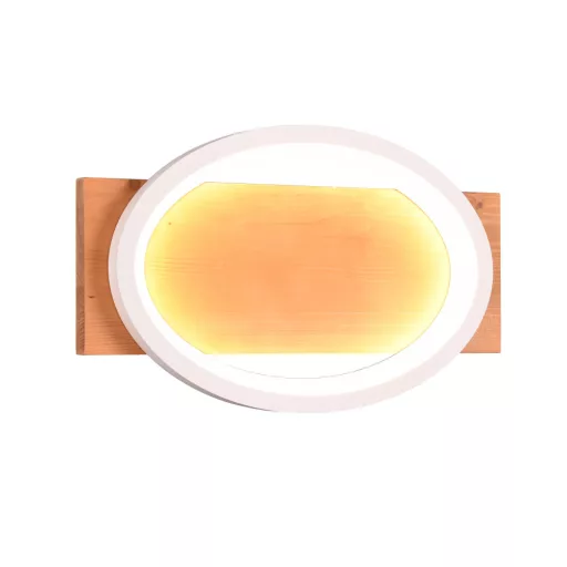 Fehér színű fém és fa vázas fali lámpa fehér színű fém és műanyag búrával, meleg fehér színhőmérsékletű beépített LED fényforrással. A lámpa egyéb funkciói: fényerőszabályzós. A lámpa fényereje fali kapcsoló segítségével több lépcsőben szabályozható (25-50-100%).