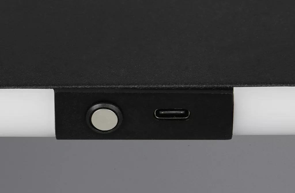 Matt fekete színű fém vázas, akkumulátoros fali lámpa műanyag betéttel, beépített LED fényforrással. A lámpához távirányító tartozik, mely segítségével állítható a LED fényereje, színhőmérséklete(2700-6500K) meleg és hideg fehér tartomány között. A lámpa fényereje a lámpán lévő érintőkapcsoló segítségével is állítható. A lámpa mágnesesen kapcsolódik a falra felszerelet ellendarabhoz. Így töltéshez könnyedén levehető. A lámpa töltése 4-5 órát vesz igénybe, amivel 5-6 órát képes világítani. A lámpa felfelé és lefelé is világít.