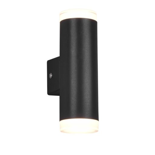 Matt fekete színű műanyag fürdőszobai fali lámpa opálos műanyag betéttel, meleg fehér színhőmérsékletű beépített LED fényforrással, IP44-es védelemmel. A lámpa felfelé és lefelé egyaránt világít.