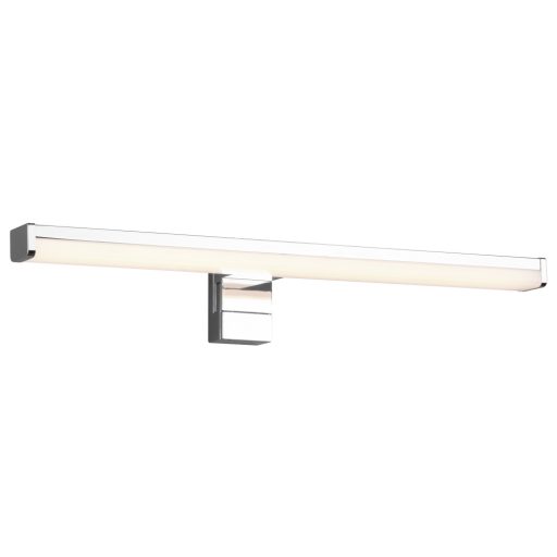 Króm és fehér színű műanyag fürdőszobai fali lámpa beépített meleg fehér színhőmérsékletű LED fényforrással, IP44-es védelemmel. A lámpa falra, vagy bútorra is szerelhető.