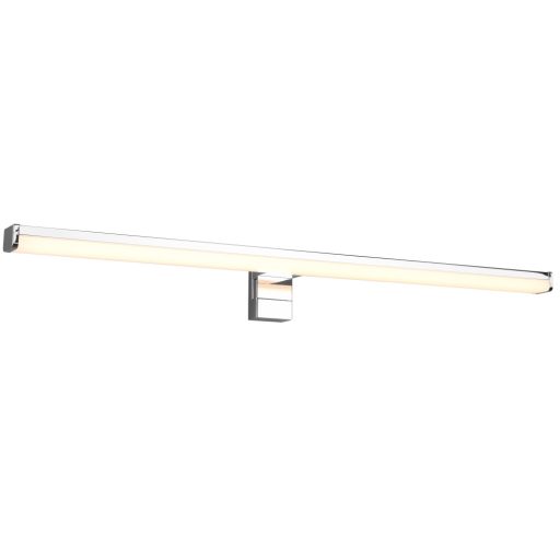 Króm és fehér színű műanyag fürdőszobai fali lámpa beépített meleg fehér színhőmérsékletű LED fényforrással, IP44-es védelemmel. A lámpa falra, vagy bútorra is szerelhető.