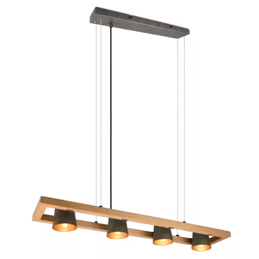 Antikolt nikkel színű fém és fa vázas függeszték lámpa kívül antikolt nikkel, belül arany színű fém billenthető ernyőkkel, E14-es foglalattal.