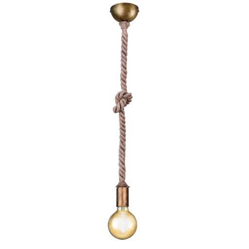 Antik sárgaréz színű fém vázas búra nélküli függeszték lámpa kötél dekorral, E27-es foglalattal.