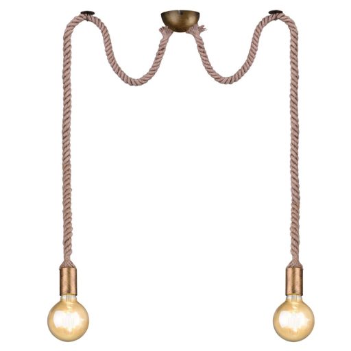 Antik sárgaréz színű fém vázas búra nélküli függeszték lámpa kötél dekorral, E27-es foglalattal.
