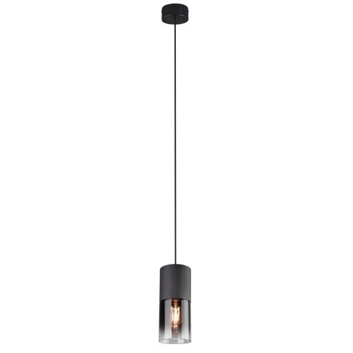 Matt fekete színű fém vázas függeszték lámpa füstös üveg búrával, E27-es foglalattal.