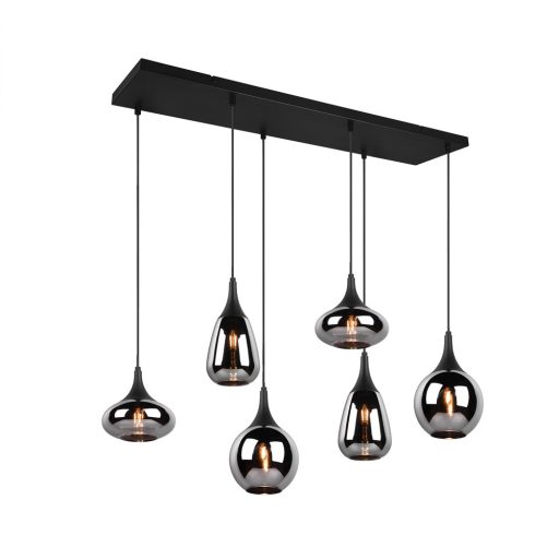 Fekete színű fém vázas függeszték fekete-króm színű üveg búrával, E14-es foglalattal.