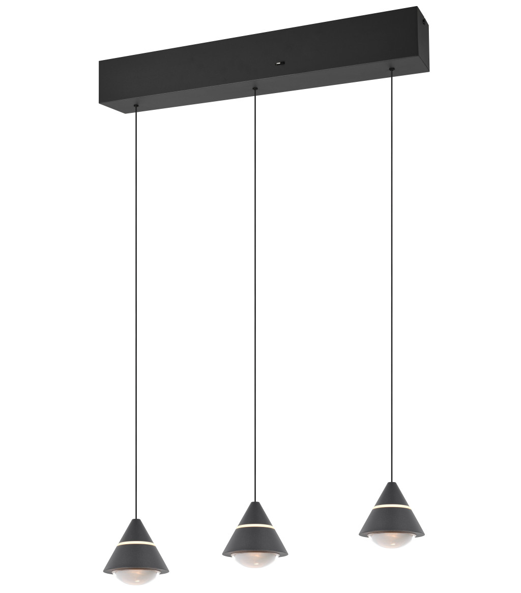 Fekete színű fém függesztett lámpa beépített LED fényforrással. A lámpa színhőmérséklete a lámpatesten lévő kapcsoló segítségével állítható 2300/3000/4000Kelvinre azaz extra meleg/meleg/természetes fehér színre. A lámpa belógása 60-200cm között állítható a lámpafej fel/le mozgatásával (lift me).