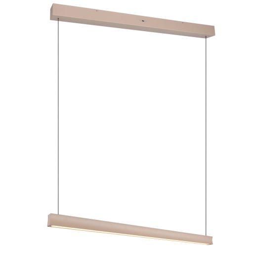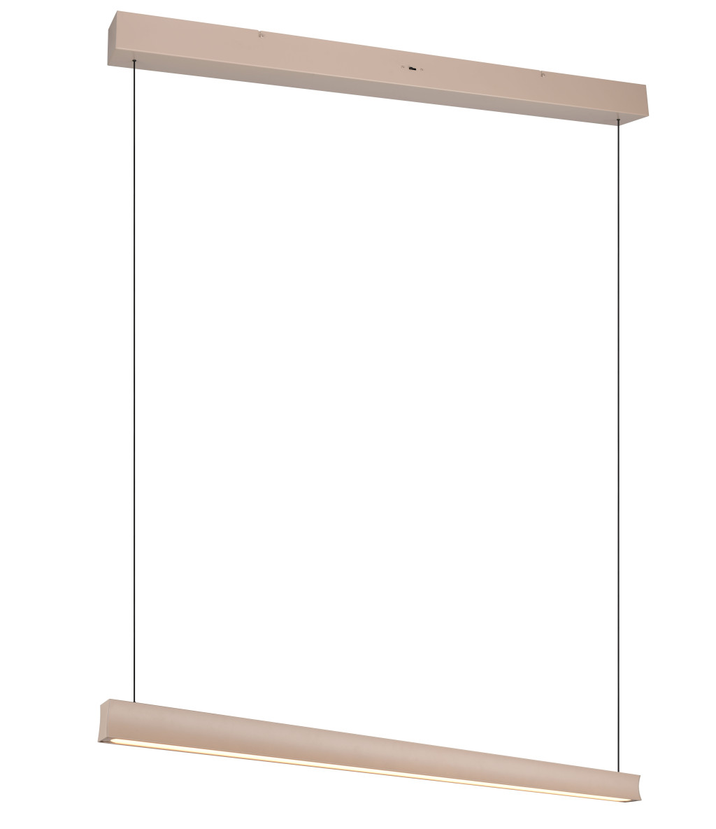 Meleg bézs színű fém vázas függesztett lámpa beépített LED fényforrással. A lámpa színhőmérséklete a lámpán lévő kapcsoló segítségével állítható 2300/3000/4000Kelvinre azaz extra meleg/meleg/természetes fehér színre. A lámpa fényereje fali kapcsoló segítségével több lépcsőben szabályozható (25-50-100%). A lámpa belógása 20-200cm között állítható a lámpafej fel/le mozgatásával (lift me).