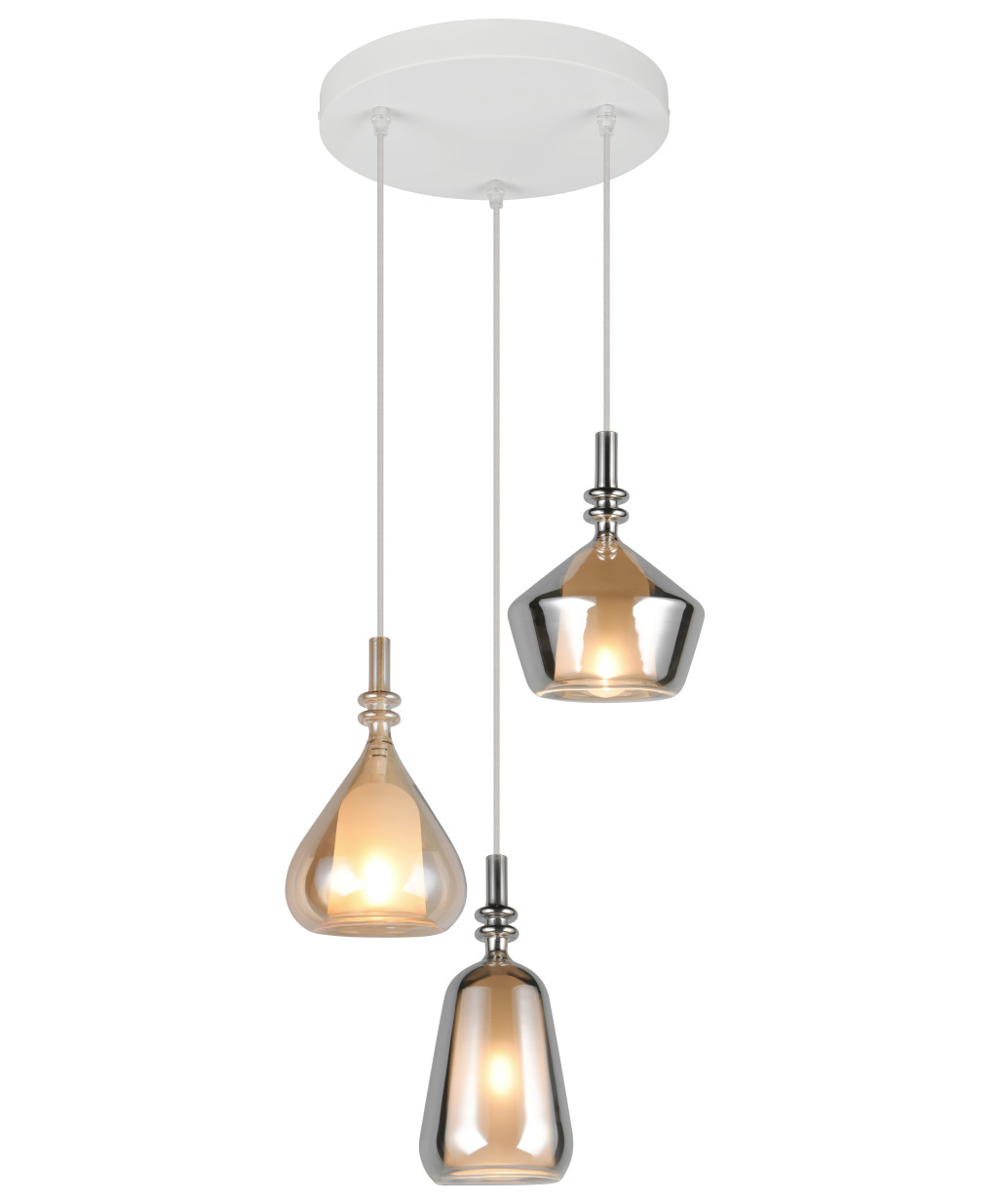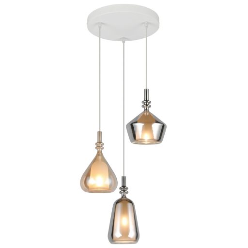 Matt fehér színű fém vázas függesztett lámpa borostyán és füstös krómos színű üveg búrával, 3db E14-es foglalattal.