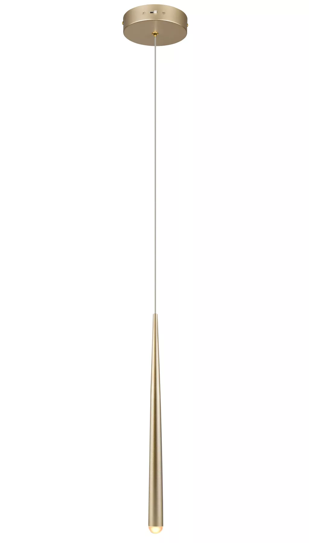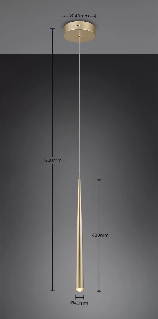 Prémium Trio függeszték lámpa arany színű fém vázzal, kecses, elnyúló csepp alakú fejjel, beépített LED fényforrással. A mennyezeti elem oldalán található kapcsoló segítségével a LED színhőmérséklete beállítható 2300 vagy 3000 vagy 4000 Kelvinre (extra meleg vagy meleg vagy természetes fehér színhőmérsékletre). A LED fényereje a fali kapcsoló többszöri fel/lekapcsolásával állítható 25-50-100% között.