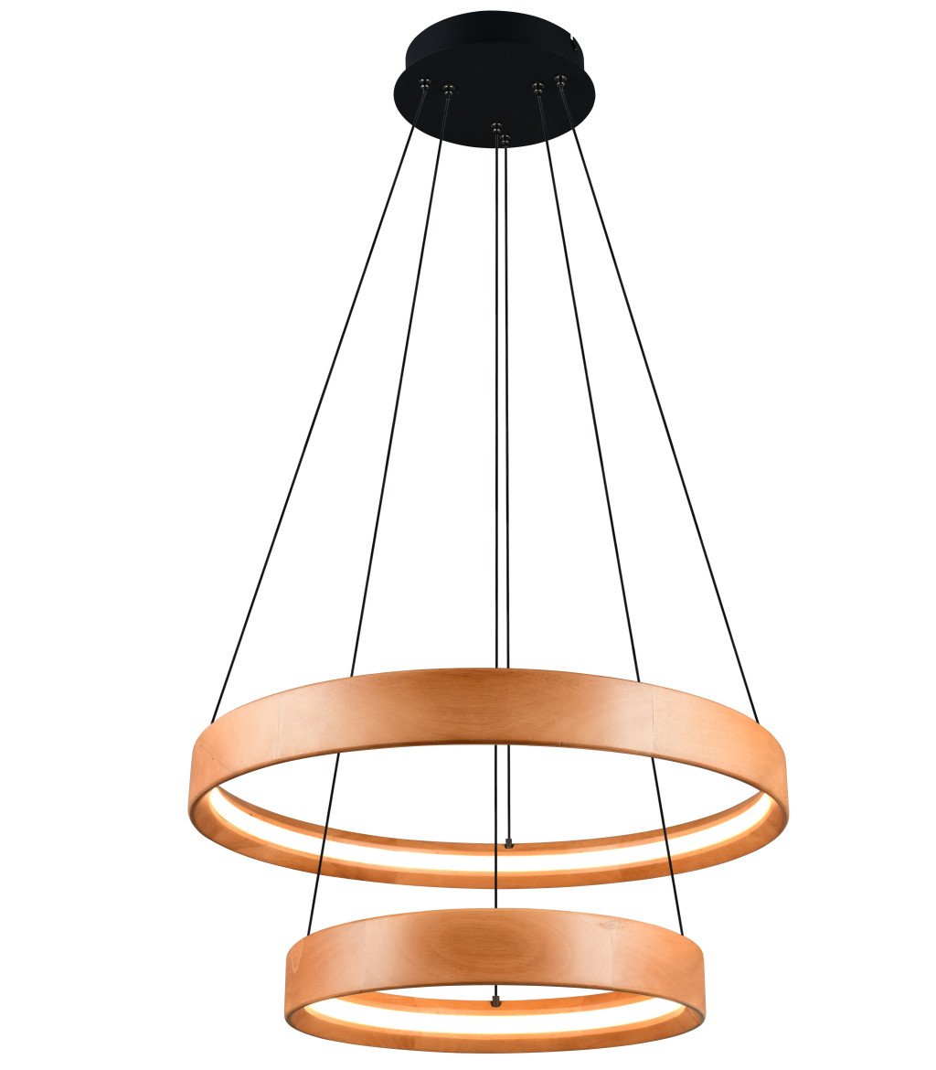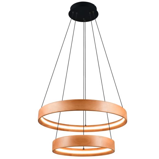 Fekete színű fém vázas mennyezeti lámpa fa búrával, műanyag betéttel, meleg fehér színhőmérsékletű beépített LED fényforrással. A lámpa fényereje fali kapcsoló segítségével több lépcsőben szabályozható (25-50-100%).