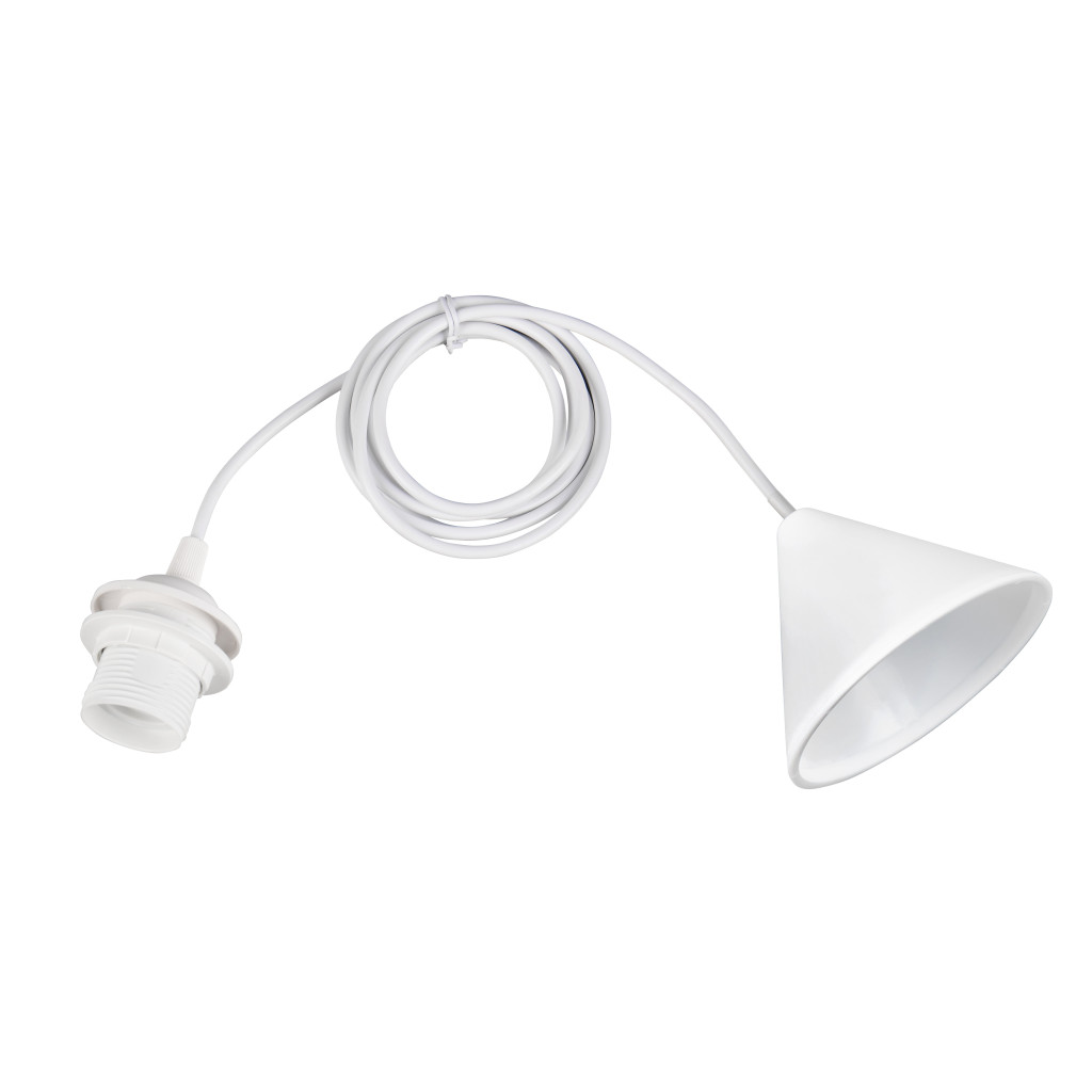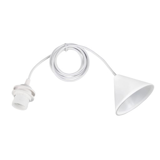Fehér színű műanyag búra nélküli függeszték max. 200cm belógással, 1db E27-es foglalattal. A függesztékre külön tetszőleges műanyag vagy textil ernyő rögzíthető a gyűrű segítségével.