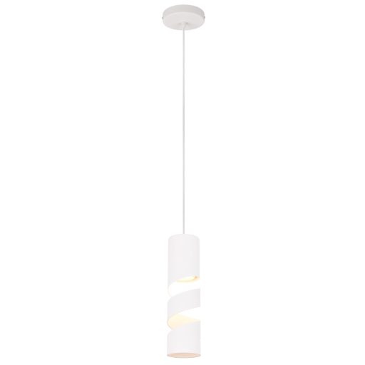 Matt fehér színű fém vázas függesztett lámpa sprilál henger búrával, GU10-es foglalattal.