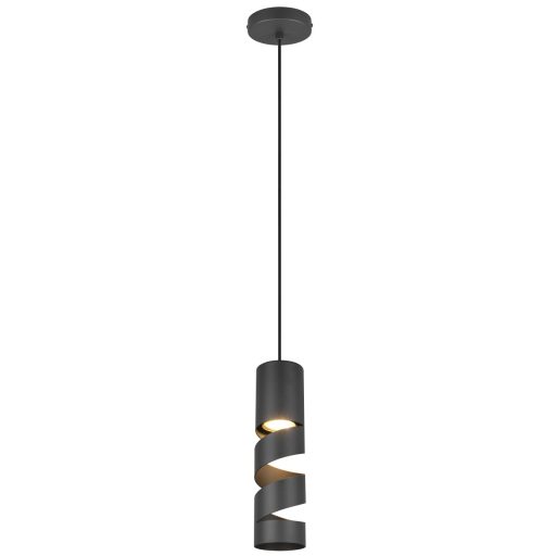 Matt fekete színű fém vázas függesztett lámpa sprilál henger búrával, GU10-es foglalattal.