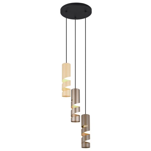 Matt fekete színű fém vázas függesztett lámpa kávé, barna és bézs színű, sprilál henger búrával, GU10-es foglalattal.