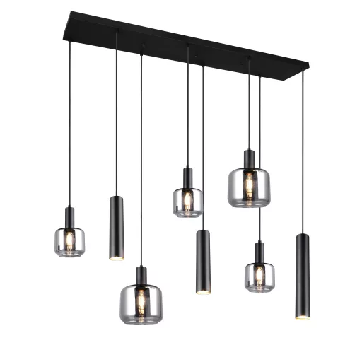 Fekete színű fém függesztett lámpa 2 féle méretű krómozott üveg búrával, háromban E14-es, kettőben E27-es foglalattal, illetve 3db fém fejjel, bennük GU10-es foglalattal.