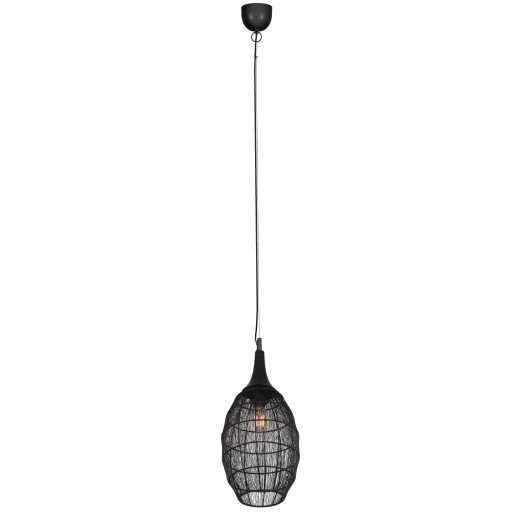 Matt fekete színű fém függesztett lámpa különleges és dekoratív hosszúkás, 26cm széles fémrács búrával, E27-es foglalattal.