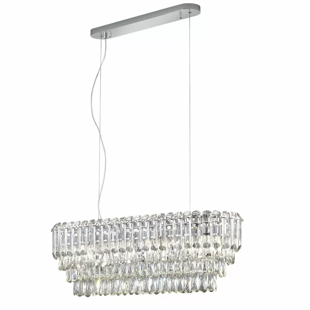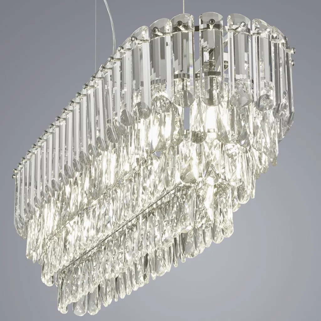 Króm színű fém vázas függesztett lámpa átlátszó kristály elemekből álló búrával, 10db E14-es foglalattal.