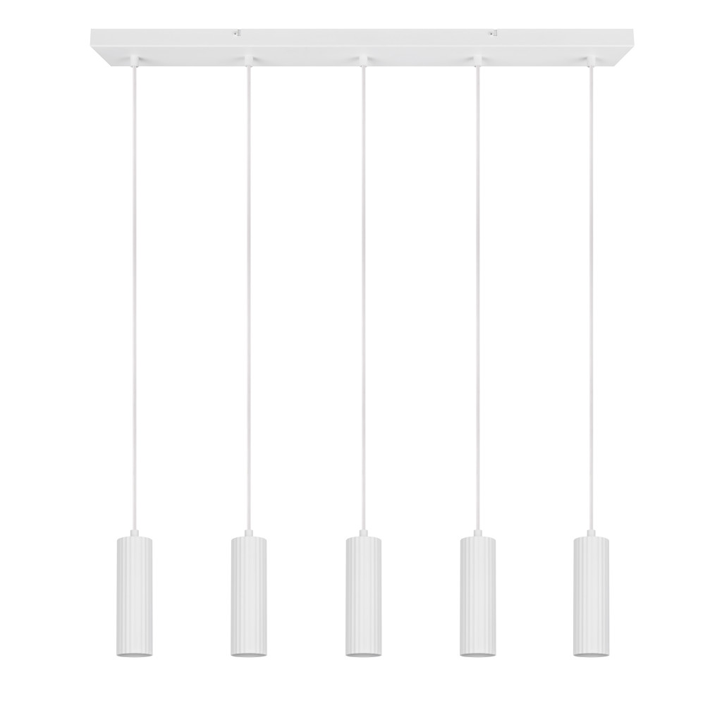 Matt fehér színű fém függesztett lámpa dekoratív, bordázott fejekkel, GU10-es foglalattal.