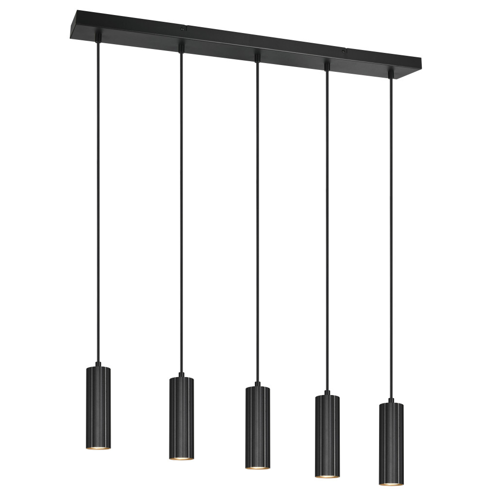 Matt fekete színű fém függesztett lámpa dekoratív, bordázott fejekkel, GU10-es foglalattal.