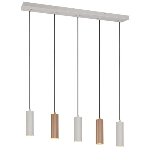 Világos szürke színű fém függesztett lámpa dekoratív, kávé színű bordázott fejekkel, GU10-es foglalattal.