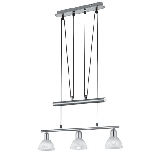 Matt nikkel színű fém vázas lehúzható függeszték fehér színű alabástrom üveg búrával, 3db E14-es cserélhető LED fényforrással. A lámpa belógása 95-160cm között állítható.