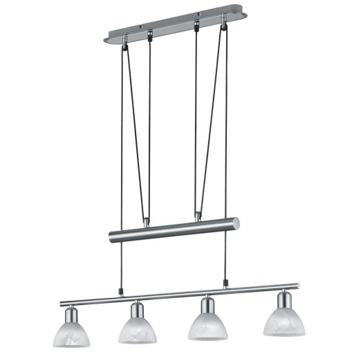 Matt nikkel színű fém vázas lehúzható függeszték fehér színű alabástrom üveg búrával, 4db E14-es cserélhető LED fényforrással. A lámpa belógása 95-160cm között állítható.