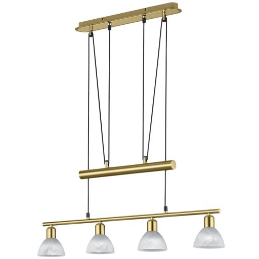 Matt sárgaréz színű fém vázas lehúzható függeszték fehér színű alabástrom üveg búrával, 4db E14-es cserélhető LED fényforrással. A lámpa belógása 95-160cm között állítható.
