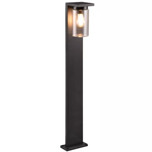 Fekete színű kültéri alumínium öntvény álló lámpa üveg búrával, E27-es foglalattal és IP44-es védelemmel, alkonykapcsolóval. Az alkonykapcsoló opcionálisan használható, a foglalat melletti kapcsolóval ki/be kapcsolható.