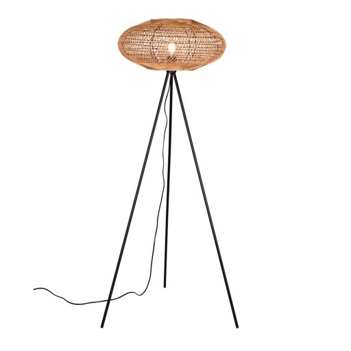 Fekete színű fém vázas álló lámpa barna színű kender búrával, E27-es foglalattal. A lámpa egyéb jellemzői: vezetékre szerelt kapcsoló.