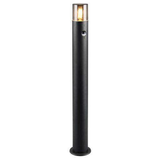 Kültéri mozgás-érzékelős álló lámpa fekete színű alumínium vázzal, füstös műanyag búrával, 1db E27-es foglalattal és IP44-es védelemmel.