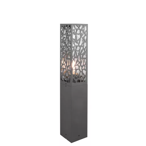 Kültéri álló lámpa antracit színű alumínium vázzal, belül átlátszó műanyag búrával, E27-es foglalattal és IP44-es védelemmel. A perforált külső búra miatt a lámpa rendkívül dekoratív, a fényszórása pedig különleges.