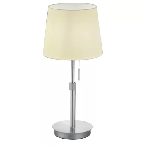 Matt nikkel színű fém vázas asztali lámpa fehér színű textil lámpaernyővel, E27-es foglalattal, húzókapcsolóval, 45-56cm között állítható magassággal.