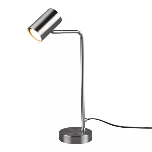 Matt nikkel színű fém asztali lámpa billenthető fejjel, GU10-es foglalattal, lámpafejen elhelyezett kapcsolóval.