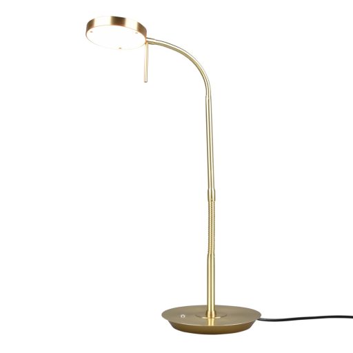Matt sárgaréz színű fém íróasztali lámpa billenthető karral, érintéssel fényerőszabályozható, bépített LED fényforrással. A LED színhőmérséklete állítható 2300,3000,4000K között.