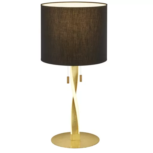 Arany színű fém vázas komód lámpa fekete színű textil lámpernyővel, E27-es foglalattal, a lámpatest szélébe épített meleg fehér szníhőmérsékletű LED fényforrással, húzó kapcsolóval. A test és a foglalat külön kapcsolható.
