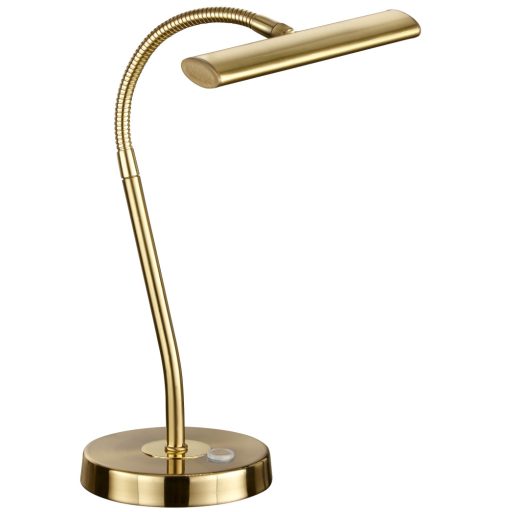 Matt sárgaréz színű fém íróasztali lámpa flexibilis karral, beépíett meleg fehér színhőmérsékletű LED fényforrással. A LED fényereje néhány lépcsőben érintéssel szabályozható.